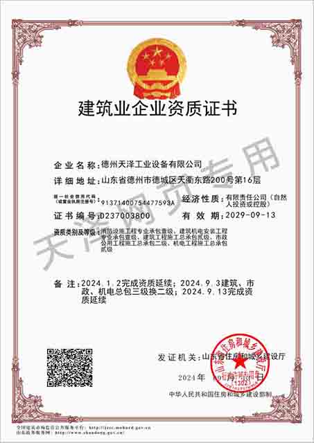 德州天澤工業(yè)設備有限公司成立于2003年(前身為德州天元集團天明工業(yè)設備安裝公司),經(jīng)過20多年的發(fā)展,現(xiàn)成長為擁有職工600余人,各類專業(yè)技術(shù)人員近300余人,年生產(chǎn)能力兩億元以上,以建筑機電安裝工程、消防設施安裝工程施工為主,集建筑工程施工、市政工程施工、建筑智能化工程施工、園林綠化工程施工、工程管理服務、物業(yè)管理、電氣機械設備銷售等多元化經(jīng)營于一體的綜合型企業(yè)。2005年,企業(yè)按照國際標準建立的質(zhì)量管理體系,通過了ISO質(zhì)量管理體系認證、環(huán)境管理體系認證、職業(yè)健康安全管理體系認證。施工工程遍布山東、河北、四川、江蘇等地,最具代表性的工程有:山東省德州市百腦匯資訊廣場機電安裝工程、德州經(jīng)濟開發(fā)區(qū)天元大廈機電安裝工程、陵城區(qū)人民醫(yī)院機電安裝工程、德州金魯班大廈機電安裝工程、河北故城金辰小區(qū)機電安裝工程、北川地震災后援建工程等。多年來,公司始終堅持“以人為本,建精品工程,創(chuàng)行業(yè)品牌”的經(jīng)營理念,先后榮獲省(市)級泰山杯、天府杯、魯安杯等獎項,申報各種功法、多項專利。